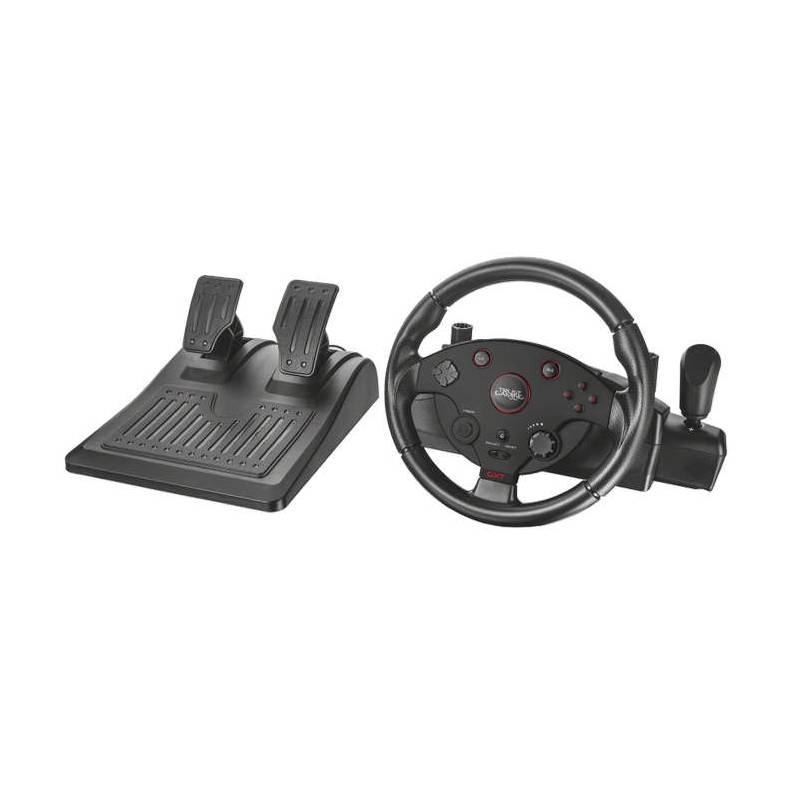 Herní sada značky Trust se skládá z ergonomického volantu, řadicí páky a pedálů. Tento komplet standardní velikosti je možné využít pro všechny typy závodních her na počítačích s OS Windows a konzolích Sony PlayStation 3.